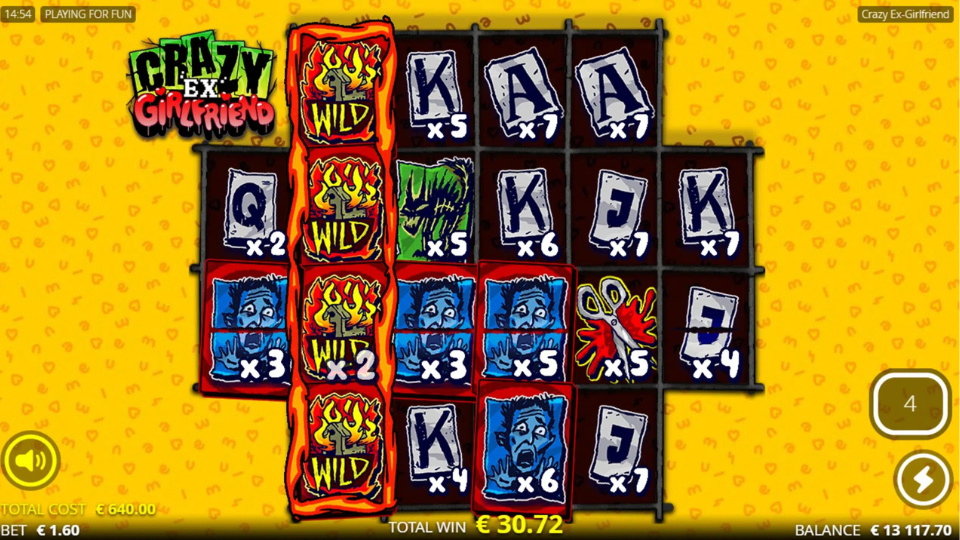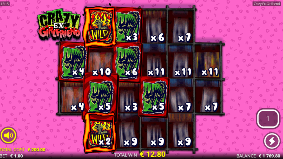 - Higher-value symbols: Thematic icons including poison bottles, a frightened man (the ex-boyfriend), a cat, a boiled bunny (in a cauldron), and the titular “Crazy Ex-Girlfriend” – the latter being the highest-paying symbol.