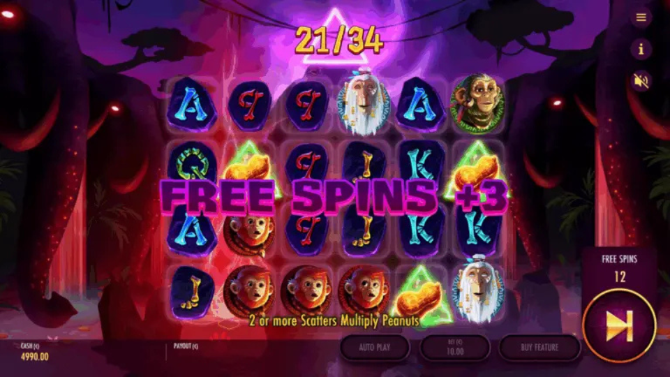 - Level 5 – Monkey Ascension (89 peanuts): The four mid-pay monkey symbols are removed from the paytable, Sticky Wilds remain, and the Mystery Feature is activated on every spin greatly increasing bonus triggering potential.